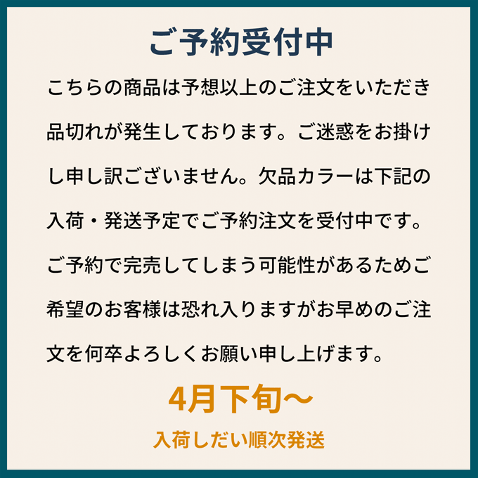 | Note | ※タンブル乾燥禁止。 ※洗濯ネットをご使用ください。 ※実物の色を表現できるよう努力しておりますが、ご覧になるモニターの環境や設定などで色の見え方には多少の違いがございます。また、屋内・屋外などの撮影環境によっても色の見え方に違いがございます。 |