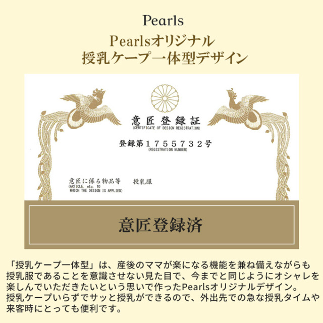 授乳時には、胸の上布を授乳ケープのようにご利用いただける Pearls オリジナルの授乳ケープ一体型デザイン。