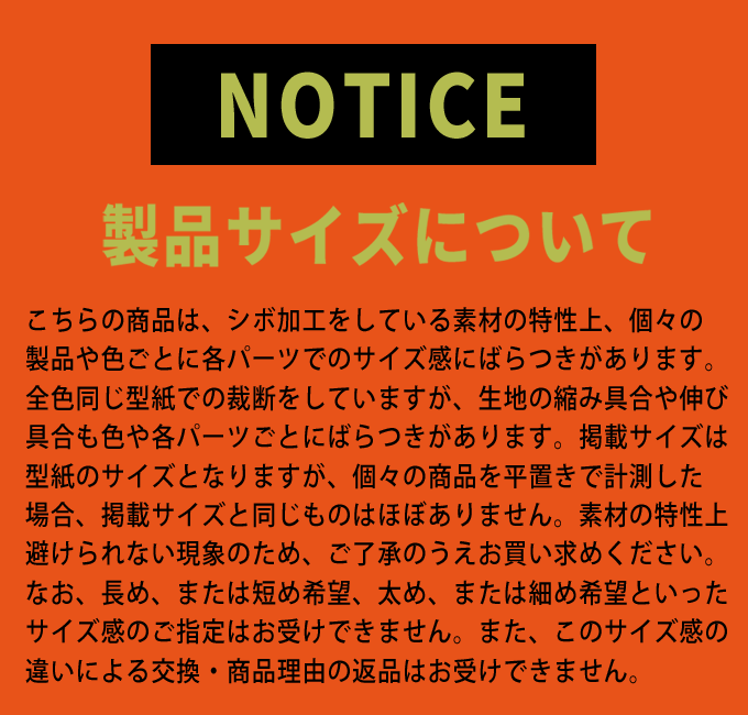 | Note | ※タンブル乾燥禁止。 ※洗濯ネットをご使用ください。 ※アイロンはあて布をしてください。 ※実物の色を表現できるよう努力しておりますが、ご覧になるモニターの環境や設定などで色の見え方には多少の違いがございます。また、屋内・屋外などの撮影環境によっても色の見え方に違いがございます。 ※シボ加工をしている素材の特性上、個々の製品や色ごとに各パーツでのサイズ感にばらつきがあります。 全色同じ型紙での裁断をしていますが、生地の縮み具合や伸び具合も色や各パーツごとにばらつきがあります。 掲載サイズは型紙のサイズとなりますが、個々の商品を平置きで計測した場合、掲載サイズと同じものはほぼありません。 素材の特性上避けられない現象のため、ご了承のうえお買い求めください。 なお、長め、または短め希望、太め、または細め希望といったサイズ感のご指定はお受けできません。 また、このサイズ感の違いによる交換・商品理由の返品はお受けできません。 |