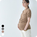 着るだけでモードなママを演出する、シャーリングデザイントップス。 素材は、コットンベースの優しい肌あたりで、伸縮性も高いベア天竺。 Tシャツ感覚でお手入れがらくちんなのも嬉しいポイント。 コンパクトなシルエットに、アシンメトリーにデザインされたフロントのシャーリングと、袖・両サイドに入れたシャーリングデザインで華やかさを持ちながら大人モードな印象。 存在感のあるデザインで、デニムやカーゴパンツに合わせてカジュアルダウンしても、スラックスやスカートできれいめに着こなしても絵になる一枚。 マタニティボトムに合うように計算した着丈でマタニティ期に可愛くご着用いただけるのはもちろん、産後はウエストインすればより、スタイリッシュに決まるアイテム。 授乳口はデザインの一部になっているので一見すると授乳服には見えませんが、肝心の授乳時にはサッと授乳できる仕様です。 マンネリ化しがちな夏のコーディネイトを彩ってくれるおすすめの一着。 ※シャーリング部分はゴムシャーリング仕様です。
