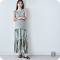 チョコミントのようなタイダイ風プリントがかわいい、産前産後兼用マタニティスカートをご紹介。 素材は伸縮性のあるネットタイプのシアーチュール。 ふんわりエアリーな風合いと裏地部分以外はうっすら透けて、素材の魅力が引き立つトレンドなデザイン。 裾に向かってゆるやかに広がるフレアは、動くたびにしなやかに揺れて、女性らしい印象を与えます。 夏はTシャツにサンダル、秋にはニットやスウェットを、トップにブーツやスニーカーで合わせる初秋カジュアルスもおすすめです。 ウエストのアジャスターゴムで、おなかの大きさに合わせて調節できるので、妊娠初期から臨月までしっかり活躍してくれるアイテムです。