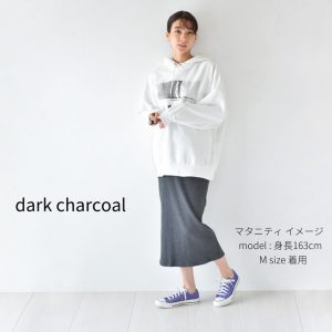 スッキリとした縦長のデザインは、産後でもかっこよく穿くことができます。マタニティでも産後でも、きれいに活用できるセミタイトスカートです。