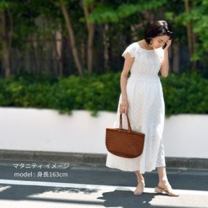 エンブロイダリーレースのマキシ丈マタニティワンピースで、おしゃれで可愛い、大人のマタニティコーデを楽しみましょう。