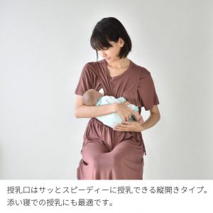 色は落ち着いたローズブラウンとチャコール、肩からウエストにかけて入る切り替え線が、授乳できるように開くようになっています。そのまま添い寝をしても、楽に授乳することができます。