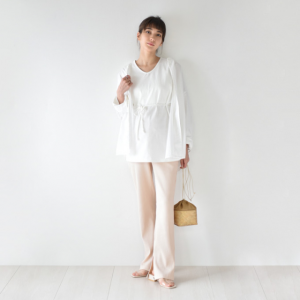 マタニティというと、ワイドでゆったりとしたパンツが定番ですが、産後兼用リブテレコパンツは履く人をスッキリと見せることができます。