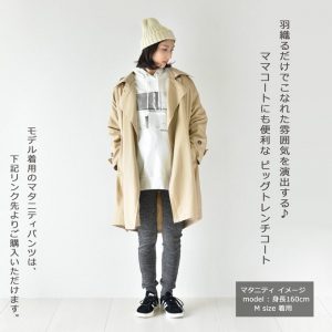 こちらは、マタニティやママコートとしてはそのまま、普段使いでは大き目のオーバーサイズのコートとしても、ウエストベルトでしっかりと締めても普通のコートとしても利用できるトレンチコートです。