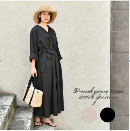 フロントボタンのガウン風マキシ丈シャツワンピースは、ブラックとベージュの2色展開です。落ち着いた色で、オフィスでもプライベートでも、大人の女性を演出します。